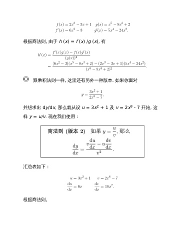 根据商法则, 由于 h (x) = f (x) /g (x), 有 跟乘积法则一样, 这里还有另外一种版本. 如果你面对 2 8 并想求出 dy/dx, 那么就从设 u = 3x + 1 及 v = 2x - 7 开始, 这 样 y = u/v. 现在我们使用: 汇总表如下: 根据商法则,