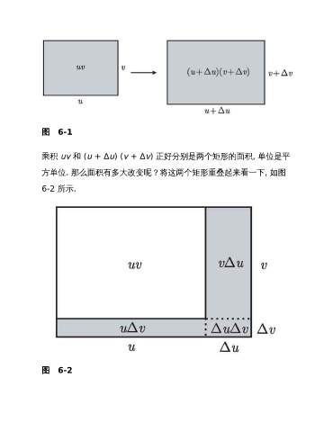 图 6-1 乘积 uv 和 (u + Δu) (v + Δv) 正好分别是两个矩形的面积, 单位是平 方单位. 那么面积有多大改变呢?将这两个矩形重叠起来看一下, 如图 6-2 所示. 图 6-2
