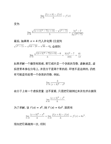变为 最后, 如果将 x = 4 代入并化简 (注意到 ), 会得到 如果求解一个极限有困难, 那它或许是一个伪装的导数. 迹象就是, 虚 拟变量本身在分母上, 并且分子是两个量的差. 即使不是这样的, 仍然 有可能是在处理一个伪装的导数. 例如, 在分子上有一个虚拟变量. 这不要紧, 只需把它颠倒过来并先求出极限 5 6 为了求解, 设 f (x) = x , 则 f' (x) = 6x . 因而有 现在把它再颠倒一次, 得到