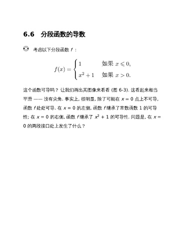 6.6 分段函数的导数 考虑以下分段函数 f : 这个函数可导吗? 让我们画出其图像来看看 (图 6-3). 这看起来相当 平滑 —— 没有尖角. 事实上, 很明显, 除了可能在 x = 0 点上不可导, 函数 f 处处可导. 在 x = 0 的左侧, 函数 f 继承了常数函数 1 的可导 2 性; 在 x = 0 的右侧, 函数 f 继承了 x + 1 的可导性. 问题是, 在 x = 0 的两段接口处上发生了什么?