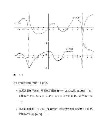 图 6-8 我们把所用的思想做一下总结. 当原始图像平坦时, 导函数的图像有一个 x 轴截距. 在上例中, 它 们出现在 x = -5, x = -2, x = 1, x = 3 及区间 [5, 6] 的每一点 上. 当原始图像的一部分是一条直线时, 导函数的图像是常数 (上例中, 它出现在区间 [4, 5] 上).