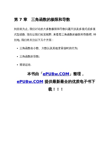 第 7 章 三角函数的极限和导数 到目前为止, 我们讨论的大多数极限和导数问题只涉及多项式或多项 式型函数. 现在让我们拓宽视野, 来看看三角函数的极限和导数吧. 特 别地, 我们将关注以下几个方面: 三角函数在小数、大数以及其他变量值时的行为; 三角函数的导数; 简谐运动. 本书由「ePUBw.COM」整理, ePUBw.COM 提供最新最全的优质电子书下 载!!!
