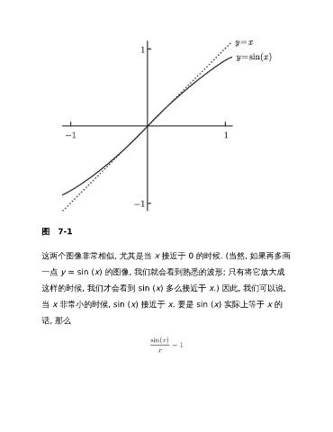 图 7-1 这两个图像非常相似, 尤其是当 x 接近于 0 的时候. (当然, 如果再多画 一点 y = sin (x) 的图像, 我们就会看到熟悉的波形; 只有将它放大成 这样的时候, 我们才会看到 sin (x) 多么接近于 x.) 因此, 我们可以说, 当 x 非常小的时候, sin (x) 接近于 x. 要是 sin (x) 实际上等于 x 的 话, 那么