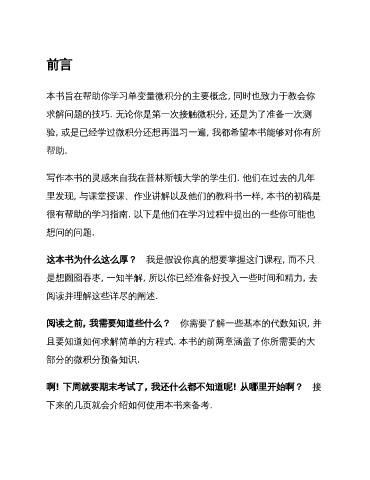 本书旨在帮助你学习单变量微积分的主要概念, 同时也致力于教会你