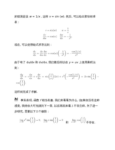 的猜测是设 w = 1/x , 这样 v = sin (w). 然后, 可以给出那张标准 表: 现在, 可以使用链式求导法则: 由于有了 du/dx 和 dv/dx, 我们最后得以在 y = uv 上使用乘积法 则: 这样就完成了求解. 事实表明, 函数 f 相当有趣. 我们来看看为什么. (如果你没有这种 感觉, 我猜你大可先跳到下一章, 以后再回来看.) 不管怎样, 为了进一 步研究, 需要以下三个极限: 和 不存在.