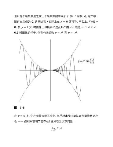 最后这个极限就是之前三个极限中的中间那个 (用 h 替换 x), 这个极 限存在且值为 0. 这意味着 f 实际上在 x = 0 处可导. 事实上, f' (0) = 0. 从 y = f (x) 时图像上你能看出这点吗?图 7-6 就是 -0.1 < x < 2 2 0.1 时图像的样子, 伴有包络函数 y = x 和 y = -x . 图 7-6 在 x = 0 上, 它在我看来很不稳定, 似乎根本无法确认在那里导数会存 在 —— 但刚刚证明了它存在! 这就引出以下问题: