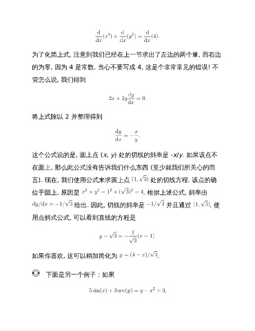 这个公式说的是, 圆上点 (x, y) 处的切线的斜率是 -x/y. 如果该点不