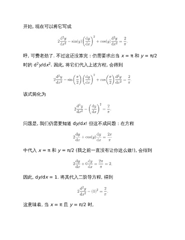 开始, 现在可以将它写成 呼, 可费老劲了. 不过这还没算完:仍需要求出当 x = π 和 y = π/2 2 2 时的 d y/dx . 因此, 将它们代入上述方程, 会得到 该式简化为 问题是, 我们仍需要知道 dy/dx! 但这不成问题:在方程 中代入 x = π 和 y = π/2 (我之前一直没有让你这么做!), 会得到 因此, dy/dx = 1. 将其代入二阶导方程, 得到 这意味着, 当 x = π 且 y = π/2 时,