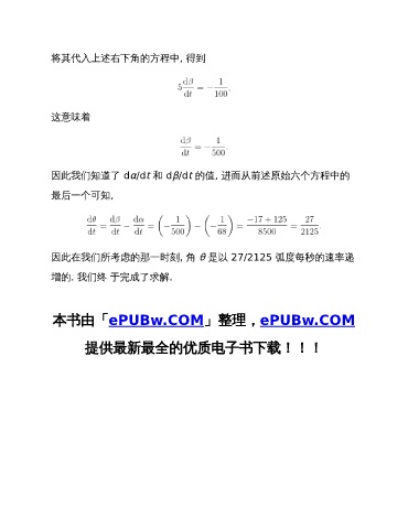 将其代入上述右下角的方程中, 得到 这意味着 因此我们知道了 dα/dt 和 dβ/dt 的值, 进而从前述原始六个方程中的 最后一个可知, 因此在我们所考虑的那一时刻, 角 θ 是以 27/2125 弧度每秒的速率递 增的. 我们终 于完成了求解. 本书由「ePUBw.COM」整理,ePUBw.COM 提供最新最全的优质电子书下载!!!