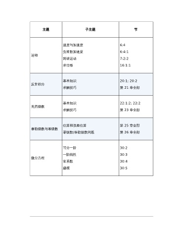 主题 子主题 节 速度与加速度 6:4 负常数加速度 6:4:1 运动 简谐运动 7:2:2 求位移 16:1:1 基本知识 20:1; 20:2 反常积分 求解技巧 第 21 章全部 基本知识 22:1:2; 22:2 无穷级数 求解技巧 第 23 章全部 估算和误差估算 第 25 章全部 泰勒级数与幂级数 幂级数/泰勒级数问题 第 26 章全部 可分一阶 30:2 一阶线性 30:3 微分方程 常系数 30:4 建模 30:5