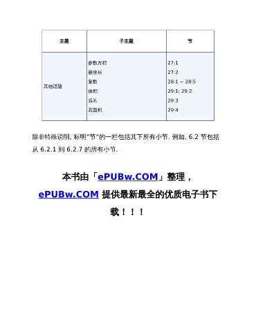 主题 子主题 节 参数方程 27:1 极坐标 27:2 复数 28:1 ~ 28:5 其他话题 体积 29:1; 29:2 弧长 29:3 表面积 29:4 除非特殊说明, 标明“节”的一栏包括其下所有小节. 例如, 6.2 节包括 从 6.2.1 到 6.2.7 的所有小节. 本书由「ePUBw.COM」整理, ePUBw.COM 提供最新最全的优质电子书下 载!!!