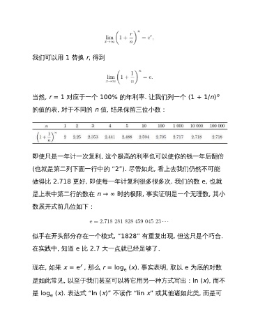 是上表中第二行的数在 n → ∞ 时的极限, 事实证明是一个无理数, 其小