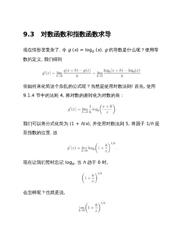 9.3 对数函数和指数函数求导 现在情形变复杂了. 令 g (x) = log (x). g 的导数是什么呢?使用导 b 数的定义, 我们得到 但如何来化简这个杂乱的公式呢?当然是使用对数法则! 首先, 使用 9.1.4 节中的法则 4, 将对数的差转化为对数的商: 我们可以将分式化简为 (1 + h/x), 并使用对数法则 5, 将因子 1/h 提 至指数的位置. 故 现在让我们暂时忘记 log . 当 h 趋于 0 时, b 会怎样呢?也就是说,