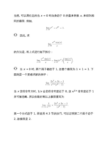 当然, 可以用任意的当 x → 0 时自身趋于 0 的量来替换 x, 来得到相 同的极限. 例如, 因此, 求 的方法是, 将上式进行如下拆分: 当 x → 0 时, 两个因子都趋于 1, 故整个极限为 1 × 1 = 1. 下 面则是一个更难求解的例子: 当 x 变得非常大时, 1/x 会变得非常接近于 0, 故 e 1/x 非常接近于 1 并可被忽略. 所以你最好将以上极限重写为 第一个分式趋于 1, 而使用 4.3 节的技巧, 可以证明第二个因子趋于 2, 故极限是 2.