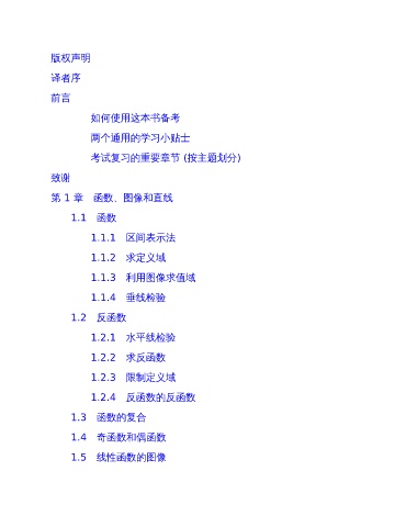 版权声明 译者序 前言 如何使用这本书备考 两个通用的学习小贴士 考试复习的重要章节 (按主题划分) 致谢 第 1 章 函数、图像和直线 1.1 函数 1.1.1 区间表示法 1.1.2 求定义域 1.1.3 利用图像求值域 1.1.4 垂线检验 1.2 反函数 1.2.1 水平线检验 1.2.2 求反函数 1.2.3 限制定义域 1.2.4 反函数的反函数 1.3 函数的复合 1.4 奇函数和偶函数 1.5 线性函数的图像