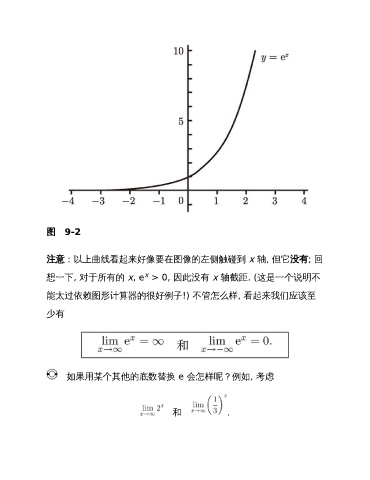 图 9-2 注意:以上曲线看起来好像要在图像的左侧触碰到 x 轴, 但它没有; 回 x 想一下, 对于所有的 x, e > 0, 因此没有 x 轴截距. (这是一个说明不 能太过依赖图形计算器的很好例子!) 不管怎么样, 看起来我们应该至 少有 如果用某个其他的底数替换 e 会怎样呢?例如, 考虑 和 .
