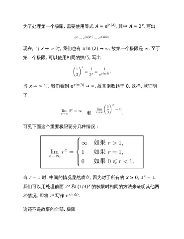 现在, 当 x → ∞ 时, 我们也有 x ln (2) → ∞, 故第一个极限是 ∞. 至于