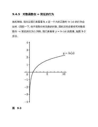 9.4.5 对数函数在 ∞ 附近的行为 旅程继续. 现在让我们来看看当 x 是一个大的正数时 ln (x) 的行为会 如何. (回想一下, 你不能取任何负数的对数, 因此没有必要研究对数函 数在 -∞ 附近的行为!) 同样, 我们来看看 y = ln (x) 的图像, 如图 9-3 所示. 图 9-3