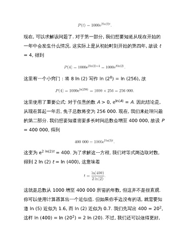 这变为 e 2 ln(2)t = 400. 为了求解这一方程, 我们对等式两边取对数,