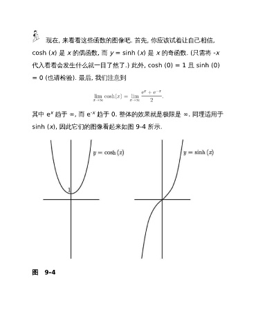 现在, 来看看这些函数的图像吧. 首先, 你应该试着让自己相信, cosh (x) 是 x 的偶函数, 而 y = sinh (x) 是 x 的奇函数. (只需将 -x 代入看看会发生什么就一目了然了.) 此外, cosh (0) = 1 且 sinh (0) = 0 (也请检验). 最后, 我们注意到 x -x 其中 e 趋于 ∞, 而 e 趋于 0. 整体的效果就是极限是 ∞. 同理适用于 sinh (x), 因此它们的图像看起来如图 9-4 所示. 图 9-4