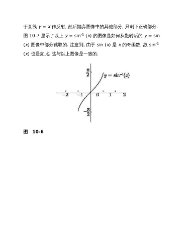 于直线 y = x 作反射, 然后抛弃图像中的其他部分, 只剩下正确部分. -1 图 10-7 显示了以上 y = sin (x) 的图像是如何从翻转后的 y = sin (x) 图像中部分截取的. 注意到, 由于 sin (x) 是 x 的奇函数, 故 sin -1 (x) 也是如此. 这与以上图像是一致的. 图 10-6