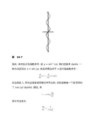 图 10-7 -1 现在, 来对反正弦函数求导. 设 y = sin (x), 我们想要求 dy/dx. 一 种方法是写出 x = sin (y), 然后对两边关于 x 进行隐函数求导: 左边就是 1, 而右边需要使用链式求导法则. 你应该检验一下是否得到 了 cos (y) (dy/dx). 因此, 有 而它可化简为
