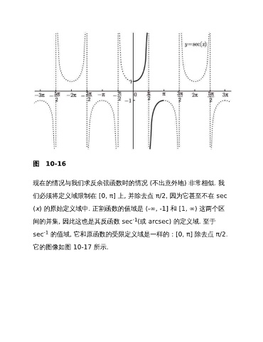 图 10-16 现在的情况与我们求反余弦函数时的情况 (不出意外地) 非常相似. 我 们必须将定义域限制在 [0, π] 上, 并除去点 π/2, 因为它甚至不在 sec (x) 的原始定义域中. 正割函数的值域是 (-∞, -1] 和 [1, ∞) 这两个区 -1 间的并集, 因此这也是其反函数 sec (或 arcsec) 的定义域. 至于 -1 sec 的值域, 它和原函数的受限定义域是一样的:[0, π] 除去点 π/2. 它的图像如图 10-17 所示.