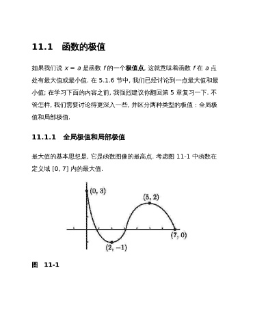 11.1 函数的极值 如果我们说 x = a 是函数 f 的一个极值点, 这就意味着函数 f 在 a 点 处有最大值或最小值. 在 5.1.6 节中, 我们已经讨论到一点最大值和最 小值; 在学习下面的内容之前, 我强烈建议你翻回第 5 章复习一下. 不 管怎样, 我们需要讨论得更深入一些, 并区分两种类型的极值:全局极 值和局部极值. 11.1.1 全局极值和局部极值 最大值的基本思想是, 它是函数图像的最高点. 考虑图 11-1 中函数在 定义域 [0, 7] 内的最大值. 图 11-1
