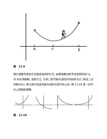 图 11-9 我们需要用某种方式描述这样的行为. 如果函数的斜率在某段区间 (a, b) 内为增函数, 或换言之, 它的二阶导数在该区间内始终为正 (假设二次 导数存在), 那么我们说该函数在该区间是凹向上的. 图 11-10 是一些凹 向上函数的图像. 图 11-10