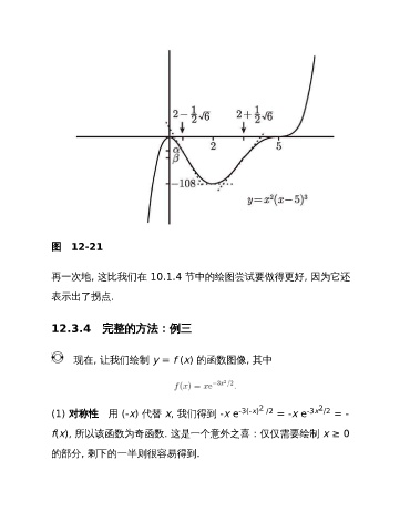 图 12-21 再一次地, 这比我们在 10.1.4 节中的绘图尝试要做得更好, 因为它还 表示出了拐点. 12.3.4 完整的方法:例三 现在, 让我们绘制 y = f (x) 的函数图像, 其中 2 2 (1) 对称性 用 (-x) 代替 x, 我们得到 -x e -3(-x) /2 = -x e -3x /2 = - f(x), 所以该函数为奇函数. 这是一个意外之喜:仅仅需要绘制 x ≥ 0 的部分, 剩下的一半则很容易得到.