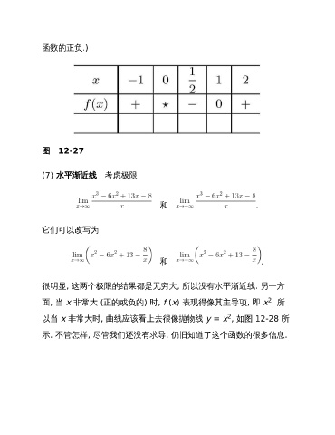 函数的正负.) 图 12-27 (7) 水平渐近线 考虑极限 和 . 它们可以改写为 和 . 很明显, 这两个极限的结果都是无穷大, 所以没有水平渐近线. 另一方 2 面, 当 x 非常大 (正的或负的) 时, f (x) 表现得像其主导项, 即 x . 所 2 以当 x 非常大时, 曲线应该看上去很像抛物线 y = x , 如图 12-28 所 示. 不管怎样, 尽管我们还没有求导, 仍旧知道了这个函数的很多信息.