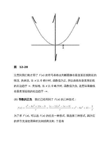 图 12-28 注意到我们刚才用了 f (x) 的符号表格去判断图像在垂直渐近线附近的 情况. 具体说, 当 x 比 0 稍小时, 函数值为正, 所以曲线在垂直渐近线 的左边趋于 ∞. 类似地, 当 x 比 0 略大时, 函数值为负, 这意味着曲线 在垂直渐近线的右边趋于 -∞. (8) 导数的正负 我们已经用到了 f (x) 的三种形式: 为了求 f' (x), 可以选 f (x) 的任意一种形式. 我选第三种形式, 因为它 的求导无须使用乘积法则或商法则. 于是有