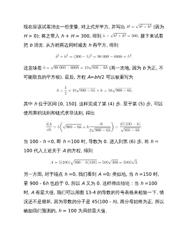 时, A 有最大值. 我们可以用图 13-4 的导数的符号表格来检验一下. 情