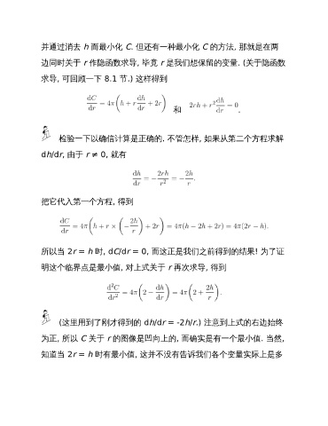 所以当 2r = h 时, dC/dr = 0, 而这正是我们之前得到的结果! 为了证