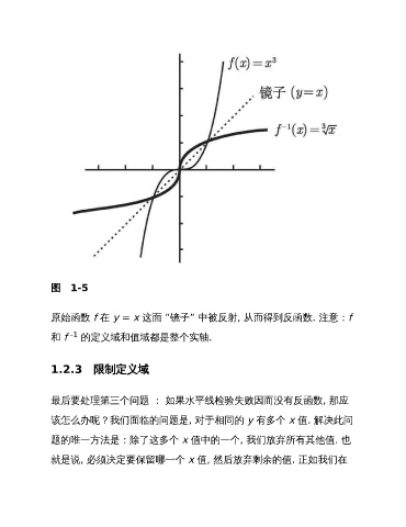 图 1-5 原始函数 f 在 y = x 这面 “镜子” 中被反射, 从而得到反函数. 注意:f -1 和 f 的定义域和值域都是整个实轴. 1.2.3 限制定义域 最后要处理第三个问题 : 如果水平线检验失败因而没有反函数, 那应 该怎么办呢?我们面临的问题是, 对于相同的 y 有多个 x 值. 解决此问 题的唯一方法是:除了这多个 x 值中的一个, 我们放弃所有其他值. 也 就是说, 必须决定要保留哪一个 x 值, 然后放弃剩余的值. 正如我们在