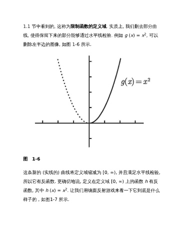 1.1 节中看到的, 这称为限制函数的定义域. 实质上, 我们删去部分曲 2 线, 使得保留下来的部分能够通过水平线检验. 例如 g (x) = x , 可以 删除左半边的图像, 如图 1-6 所示. 图 1-6 这条新的 (实线的) 曲线将定义域缩减为 [0, ∞), 并且满足水平线检验, 所以它有反函数. 更确切地说, 定义在定义域 [0, ∞) 上的函数 h 有反 2 函数, 其中 h (x) = x . 让我们用镜面反射游戏来看一下它到底是什么 样子的,如图1-7 所示.