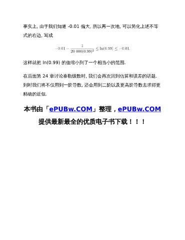 事实上, 由于我们知道 -0.01 偏大, 所以再一次地, 可以简化上述不等 式的右边, 写成 这样就把 ln(0.99) 的值缩小到了一个相当小的范围. 在后面第 24 章讨论泰勒级数时, 我们会再次回到估算和误差的话题. 到时我们将不仅用到一阶导数, 还会用到二阶以及更高阶导数去求得更 精确的近似. 本书由「ePUBw.COM」整理,ePUBw.COM 提供最新最全的优质电子书下载!!!