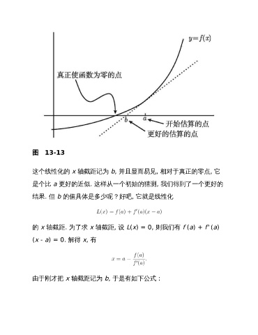 图 13-13 这个线性化的 x 轴截距记为 b, 并且显而易见, 相对于真正的零点, 它 是个比 a 更好的近似. 这样从一个初始的猜测, 我们得到了一个更好的 结果. 但 b 的值具体是多少呢?好吧, 它就是线性化 的 x 轴截距. 为了求 x 轴截距, 设 L(x) = 0, 则我们有 f (a) + f' (a) (x - a) = 0. 解得 x, 有 由于刚才把 x 轴截距记为 b, 于是有如下公式: