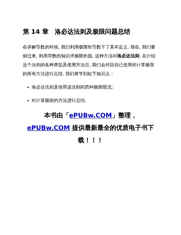 第 14 章 洛必达法则及极限问题总结 在讲解导数的时候, 我们利用极限给导数下了基本定义. 现在, 我们要 倒过来, 利用导数的知识求极限的值, 这种方法叫洛必达法则. 在介绍 这个法则的各种类型及使用方法后, 我们会对目前已使用的计算极限 的所有方法进行总结. 我们将学到如下知识点: 洛必达法则及使用该法则的四种极限情况; 对计算极限的方法进行总结. 本书由「ePUBw.COM」整理, ePUBw.COM 提供最新最全的优质电子书下 载!!!