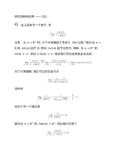 得到同样的结果 —— 3/2. 这儿还有另一个例子, 求 + 注意:当 x → 0 时, 分子分母都趋于无穷大. 为什么呢?因为当 x → + 0 时, sin(x) 趋于 0, 所以 csc(x) 趋于无穷大; 同样, 当 x → 0 时, ln(x) → -∞, 所以 1-ln(x) → ∞. 现在我们可以使用洛必达法则: 为了计算极限, 我们可以把它改写为 这样有 但对于另一个因式有 + + 因为当 x → 0 时, tan(x) → 0 , 所以我们证明了