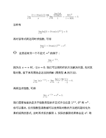 这样有 再对该等式两边同时求指数, 可得 0 这里还有另一个不定式 ∞ 的例子: 因为当 x → ∞ 时, -1/x → 0. 我们可以用同样的方法解决问题, 先对其 取对数, 接下来再用洛必达法则求解 (用类型 A 的方法). 再两边求指数, 可得 0 0 我们需要知道的是关于指数类型的不定式不仅仅是 1 ±∞ , 0 和 ∞ . 你可以看出, 任何指数型函数都可以使用取对数的方法把问题转化为 L 乘积或商的形式, 这时再求新的极限 L. 实际的极限结果将会是 e . 唯