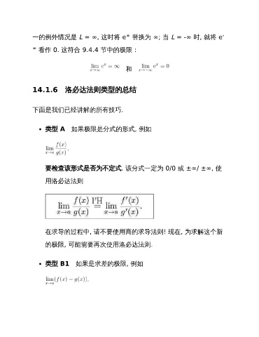∞ 一的例外情况是 L = ∞, 这时将 e 替换为 ∞; 当 L = -∞ 时, 就将 e - ∞ 看作 0. 这符合 9.4.4 节中的极限: 和 14.1.6 洛必达法则类型的总结 下面是我们已经讲解的所有技巧. 类型 A 如果极限是分式的形式, 例如 要检查该形式是否为不定式. 该分式一定为 0/0 或 ±∞/ ±∞, 使 用洛必达法则 在求导的过程中, 请不要使用商的求导法则! 现在, 为求解这个新 的极限, 可能需要再次使用洛必达法则. 类型 B1 如果是求差的极限, 例如