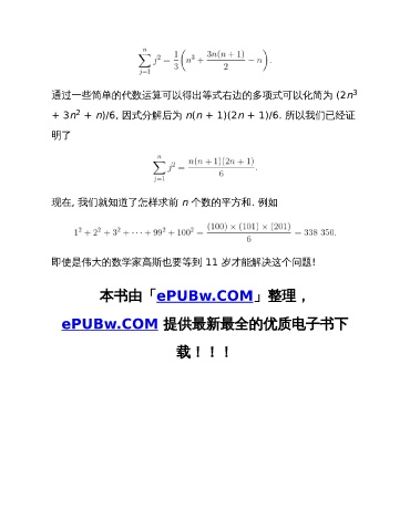 通过一些简单的代数运算可以得出等式右边的多项式可以化简为 (2n 3 2 + 3n + n)/6, 因式分解后为 n(n + 1)(2n + 1)/6. 所以我们已经证 明了 现在, 我们就知道了怎样求前 n 个数的平方和. 例如 即使是伟大的数学家高斯也要等到 11 岁才能解决这个问题! 本书由「ePUBw.COM」整理, ePUBw.COM 提供最新最全的优质电子书下 载!!!