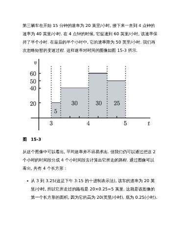 从 3 到 3.25(这是下午 3:15 的十进制表示法), 该车的速率为 20 英