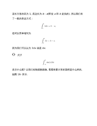 该长方形的高为 1, 底边长为 b - a(即使 a 和 b 是负的), 所以我们有 了一般的表达方式: 也可以简单地写为 因为我们可以认为 1dx 就是 dx. 式子 表示什么呢? 让我们绘制函数图像, 看看将要计算的面积是什么样的, 如图 16- 所示.