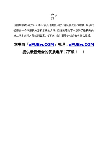 但如果被积函数为 sin(x) 或其他类似函数, 情况会变得很糟糕. 所以我 们需要一个不用长方形和求和的方法. 但这要等到下一章讲了微积分的 第二基本定理才能找到答案. 接下来, 我们看看定积分都有什么性质. 本书由「ePUBw.COM」整理,ePUBw.COM 提供最新最全的优质电子书下载!!!