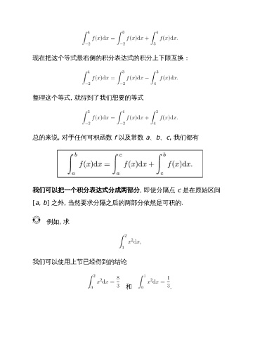 现在把这个等式最右侧的积分表达式的积分上下限互换: 整理这个等式, 就得到了我们想要的等式 总的来说, 对于任何可积函数 f 以及常数 a、b、c, 我们都有 我们可以把一个积分表达式分成两部分, 即使分隔点 c 是在原始区间 [a, b] 之外, 当然要求分隔之后的两部分依然是可积的. 例如, 求 我们可以使用上节已经得到的结论 和 .
