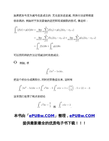 如果把加号变为减号也是成立的. 无论是加还是减, 用拆分法证明都是 很容易的. 例如对于加法要做的是把和写成极限的形式, 像这样: 可以用同样的方法证明减法时依然成立. 例如, 求 把这个积分分成两部分, 同时把常数提出来, 这时有 这里我们使用了刚才的结论 和 . 本书由「ePUBw.COM」整理,ePUBw.COM 提供最新最全的优质电子书下载!!!