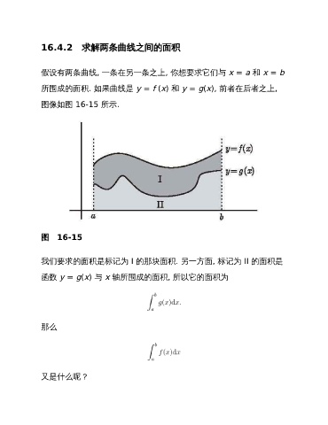 16.4.2 求解两条曲线之间的面积 假设有两条曲线, 一条在另一条之上, 你想要求它们与 x = a 和 x = b 所围成的面积. 如果曲线是 y = f (x) 和 y = g(x), 前者在后者之上, 图像如图 16-15 所示. 图 16-15 我们要求的面积是标记为 I 的那块面积. 另一方面, 标记为 II 的面积是 函数 y = g(x) 与 x 轴所围成的面积, 所以它的面积为 那么 又是什么呢?