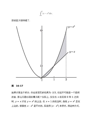 那就是大错特错了. 图 16-17 如果计算这个积分, 你会发现它的结果为 -2/3, 但这不可能是一个面积 的值. 那么问题出现在哪儿呢?实际上, 仅仅当 x 在区间 0 和 1 之间 2 2 时, y = x 才在 y = x 的上边. 在 x = 1 的右边时, 曲线 y = x 是在 2 2 上边的. 很显然 x - x 是不对的, 应该用 |x - x | 来替代. 用这种方式,